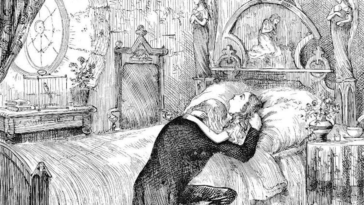 Worth’s 1872 illustration for the Household Edition of The Old Curiosity Shop highlights her grandfather’s grief at losing Little Nell.