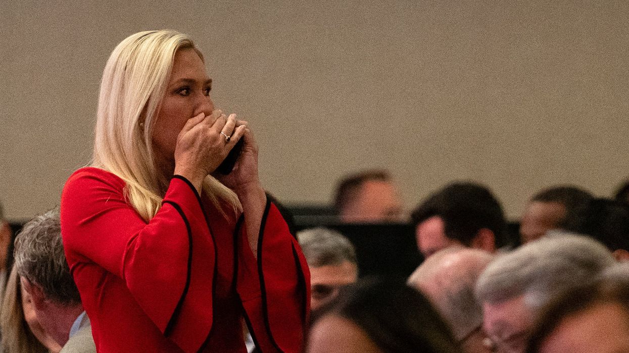 US Representative Marjorie Taylor-Greene (R-GA) takes a phone call at the Hyatt Regency hotel during a meeting with House Republicans and President-elect Donald Trump in Washington, DC, U.S. on November 13, 2024. ALLISON ROBBERT/Pool via REUTERS