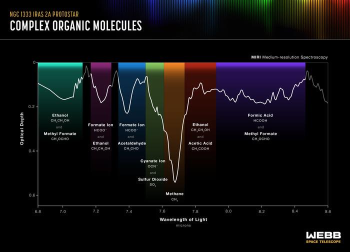 “All of these molecules can become part of comets and asteroids and eventually new planetary systems when the icy material is transported inward to the planet-forming disk as the protostellar system evolves,” said Ewine van Dishoeck of Leiden University, one of the coordinators of the science program. “We look forward to following this astrochemical trail step-by-step with more Webb data in the coming years.”