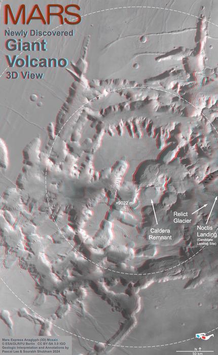 Figure 5: Noctis volcano in 3D. Anaglyph image showing portions of the Noctis volcano’s 250 km (155 mile) diameter inner zone of high elevation remains, and 450 km (280 mile) diameter outer zone of other remains associated with the volcano. In addition to the volcano’s summit, caldera remnant, and inner and outer zones, this 3D map shows the “relict glacier” discovered in 2023 and Noctis Landing, a candidate landing site for future robotic and human exploration.