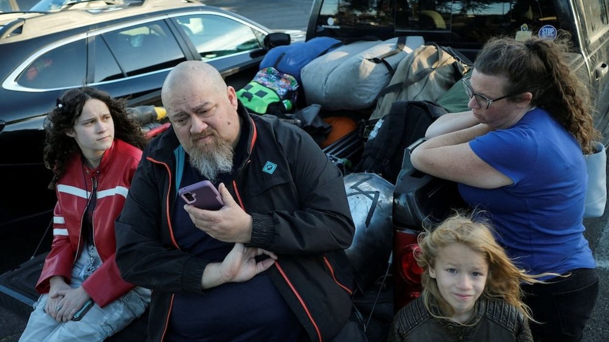 Kalliope Sidnam, 14, her father, Chief Sidnam, brother, Flynn Sidnam, 8, and mother Melissa Sidnam, wait in a parking lot, at a Red Cross evacuation center at Hart High School as firefighters and aircraft battle the Hughes Fire near Castaic Lake, north of Santa Clarita, California, U.S. January 22, 2025. REUTERS/Joel Angel Juarez