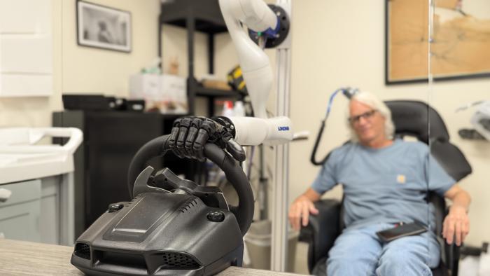 A testing participant controls a bionic hand through a brain-computer interface that allows him to feel pressure changes as the steering wheel moves in the hand.