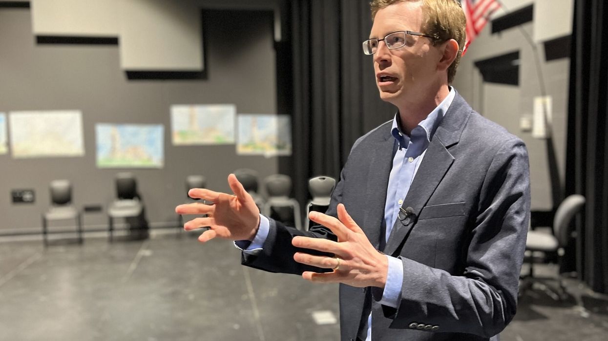 U.S. Rep. Dusty Johnson, R-South Dakota, speaks with students on May 19, 2023, in Sioux Falls. (Joshua Haiar/SD Searchlight)