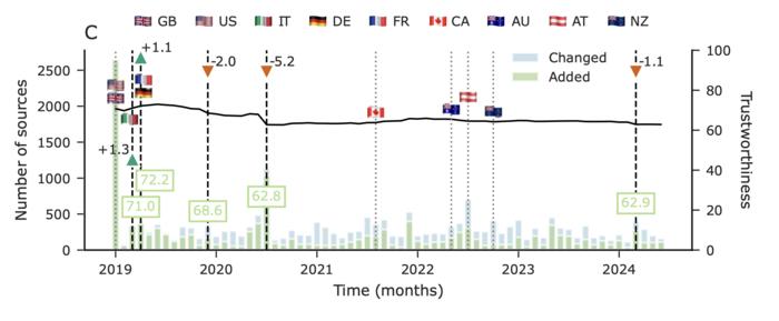 Flags and dotted lines indicate when countries were added and dashed lines with green and red arrows highlight the top five major score changes. The height of the bars describes the number of sources added vs. changed, with colors indicating the proportions. Also shown are the average trustworthiness of the sources in green text boxes.