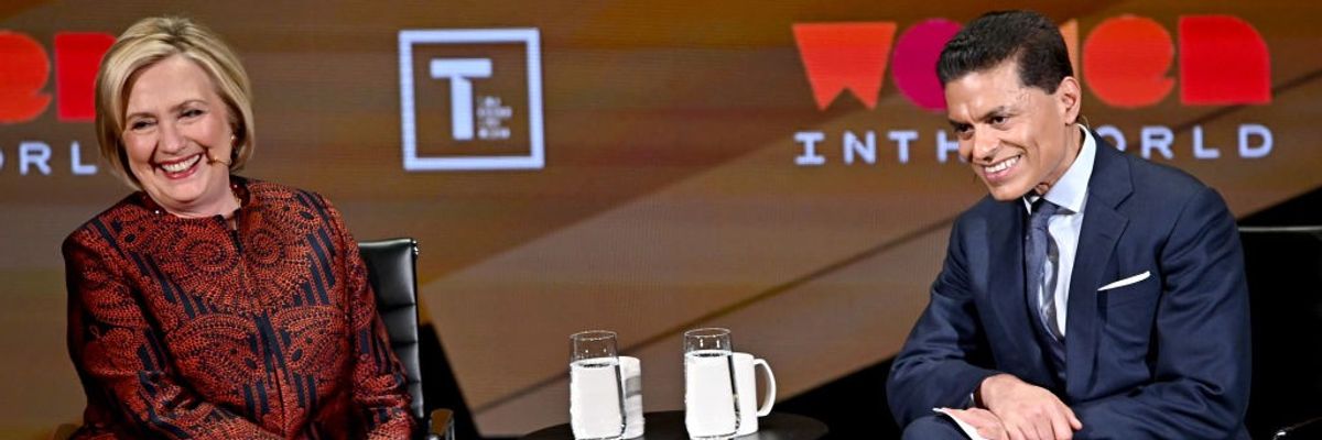 Hillary Clinton and Fareed Zakaria speak during the 10th Anniversary Women In The World Summit at David H. Koch Theater at Lincoln Center on April 12, 2019 in New York City.