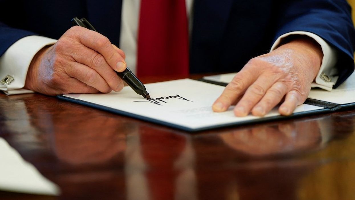 U.S. President Donald Trump signs executive orders in the Oval Office at the White House in Washington, U.S., January 30, 2025. REUTERS/Elizabeth Frantz