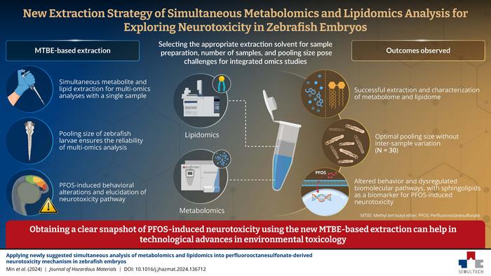Using a newly proposed extraction strategy, researchers simultaneously analyze metabolomics and lipidomics of neurotoxicity in zebrafish embryos, revealing many lipids and metabolites involved in the toxicity pathways. These findings advance our understanding of environmental toxicity using multi-omics analyses.