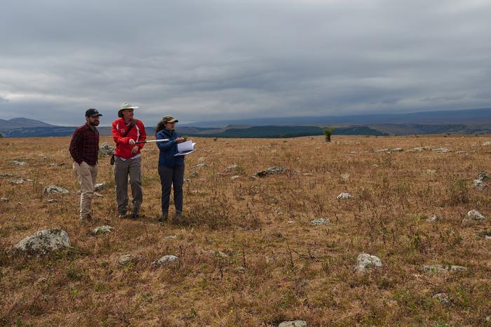 Photos of the team "ground-truthing" possible features identified in aerial photography. These photos also show how difficult it is to get an overall sense of the structure site from the ground.