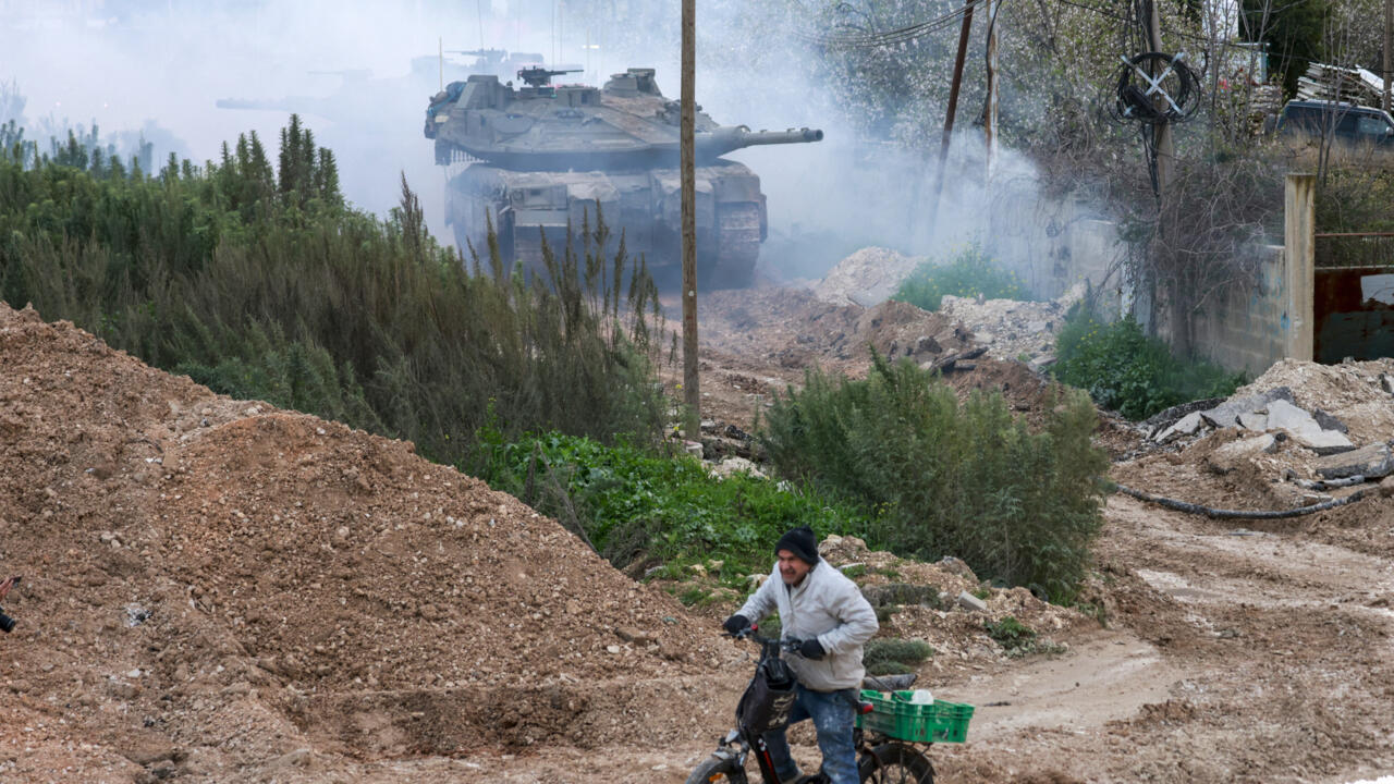 A man rides a bicycle as Israeli tanks enter the Jenin camp for Palestinian refugees in the occupied West Bank on February 23, 2025. © Jaafar Ashtiyeh, AFP