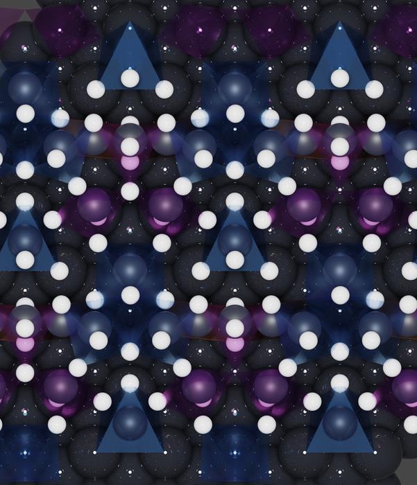 A top-view visualization of a platinum surface during cathode corrosion. Platinum and hydrogen atoms are represented in black and white, respectively. Blue and purple triangles indicate where hydrogen atoms have been bound to platinum atoms.