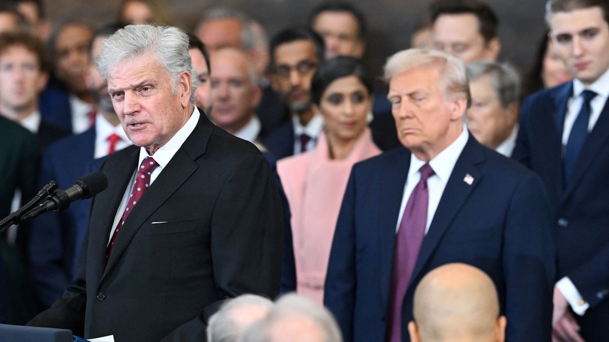 US President-elect Donald Trump (C) looks on as evangelist president of Samaritan's Purse Franklin Graham (L) devliers an invocation during the inauguration ceremony before Trump is sworn in as the 47th US President in the US Capitol Rotunda in Washington, DC, on January 20, 2025.
