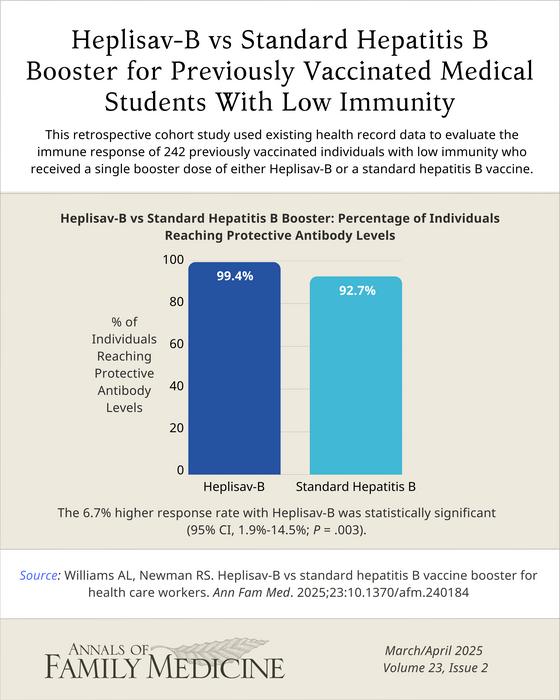 Study Approach: Researchers conducted a retrospective cohort study at the Uniformed Services University of the Health Sciences, analyzing medical records from 2019 to 2022. The study included medical students who had completed a full hepatitis B vaccine series but had low antibody levels. Participants received either a standard hepatitis B booster or a Heplisav-B booster. Their antibody levels were measured at least 30 days later to determine if they had achieved protective immunity.