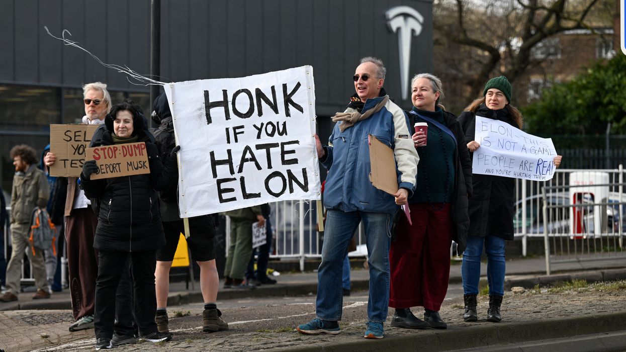 Demonstrators hold anti-Tesla posters during a protest encouraging people to boycott Tesla in opposition to Tesla CEO Elon Musk's political involvement in the U.S. government, outside the Tesla Centre Park Royal in London, Britain, March 15, 2025.