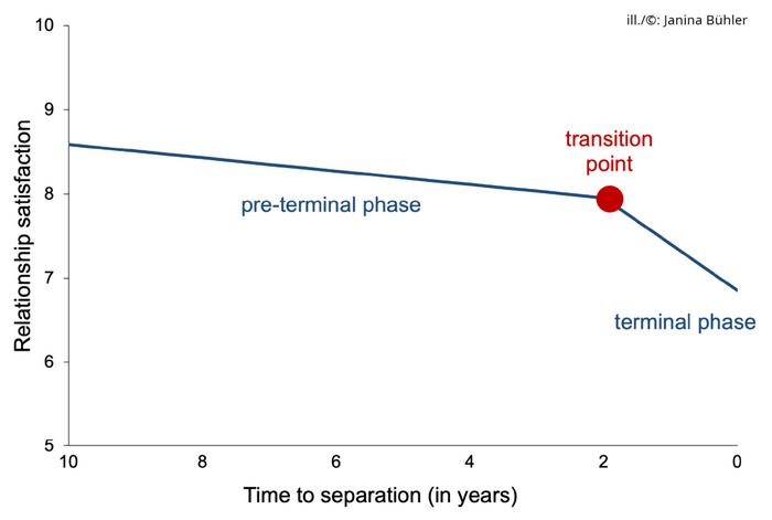 Using the available data, Bühler and Orth assessed the extent to which the satisfaction with the relationship developed in the light of their subsequent separation. "In order to better understand dissolving relationships, we examined them from the point of view of time-to-separation. To do this, we applied a concept that is in general use in other fields of psychology," said Janina Bühler. Based on the data of the four national representative studies, the researchers were able to determine that relationships can be subjected to what is known as terminal decline. This decline in relationship satisfaction occurs in two phases. The initial preterminal phase, which can have a duration of several years, is characterized by a minor decline in satisfaction. However, this is followed by a transition or tipping point from which there is an accelerated decline in satisfaction. The terminal phase of a relationship after this transition point lasts 7 to 28 months, one to two years on average. "Once this terminal phase is reached, the relationship is doomed to come to an end. This is apparent from the fact that only the individuals in the separation group go through this terminal phase, not the control group," explained Bühler.