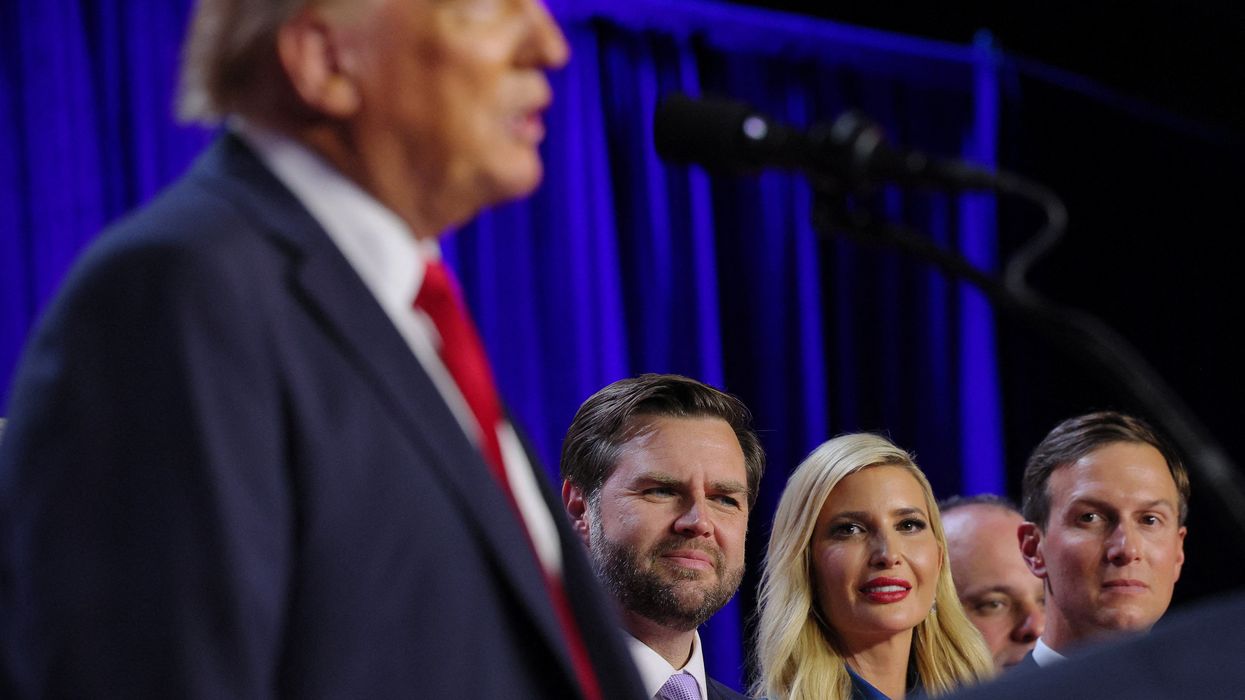JD Vance, Ivanka Trump and her husband Jared Kushner listen as Donald Trump speaks at his election night rally at the Palm Beach County Convention Center in West Palm Beach, Florida, U.S., November 6, 2024. REUTERS/Brian Snyder