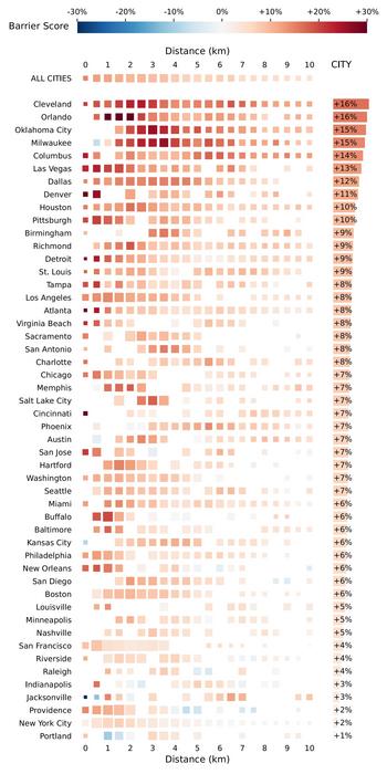 The average barrier effect of urban highways is highest in Cleveland, a city with particularly high segregation, according to the results of the study.
