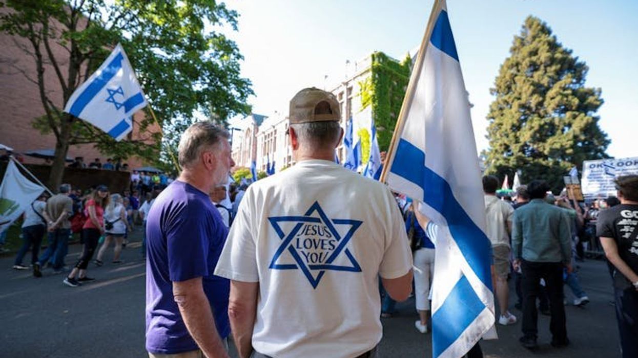 Participants in a ‘United for Israel’ march, led by The Pursuit NW Christian Church, stand on the University of Washington’s campus in May 2024.