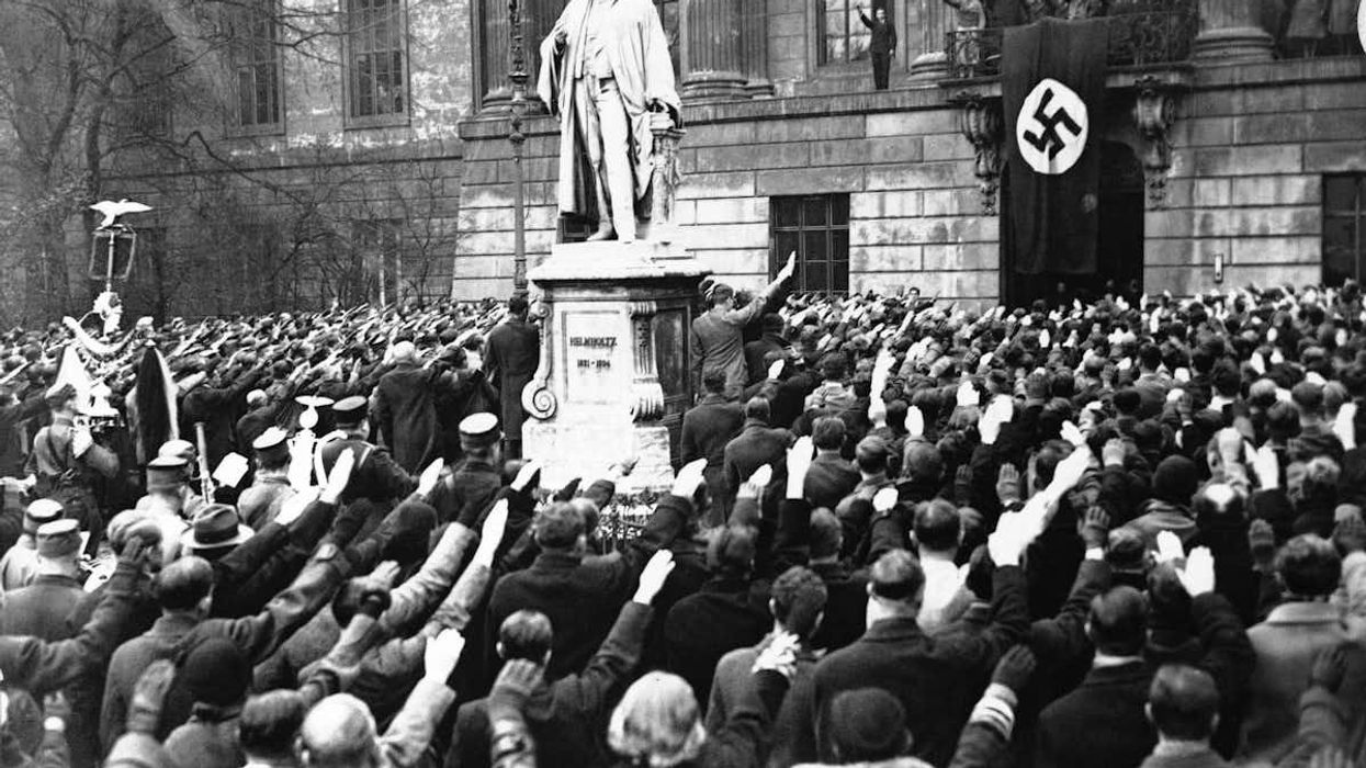 Students and other Nazi supporters gather at Humboldt University in Berlin in 1933.