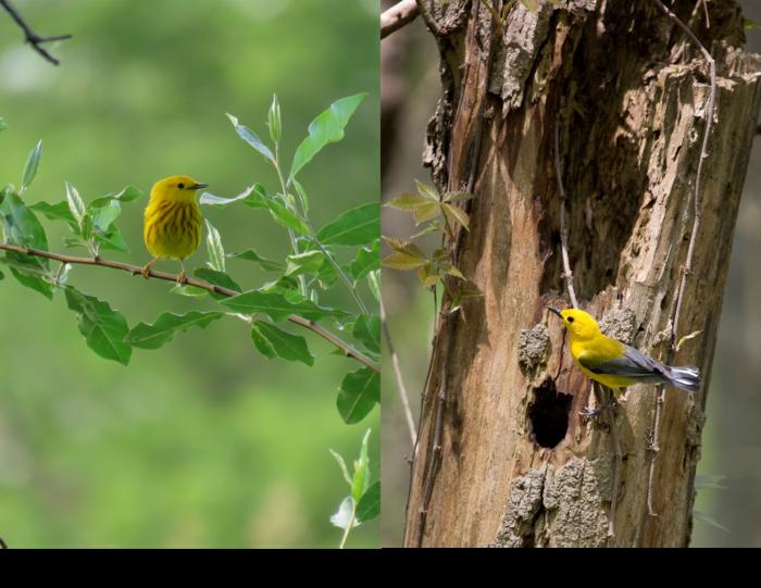 Among the pairs of species compared in the study are the Yellow Warbler (left) and the Prothonotary Warbler— an obligate cavity nester.