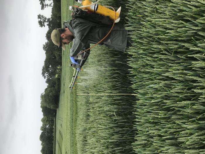 Applying the T6P biostimuant at a field trial at Rothamsted. Credit: Rothamsted Research.