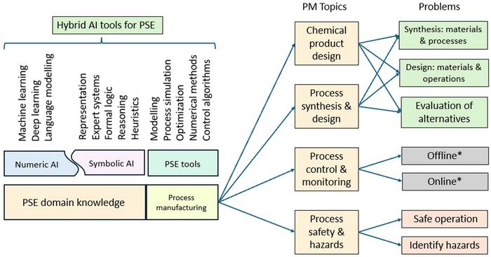 The concept of hybrid AI in PM, highlighting the connections between the various components of hybrid AI tools for PSE (left), the four selected PM topics (middle), and examples of problems (right) (where * indicates “control and monitoring”).