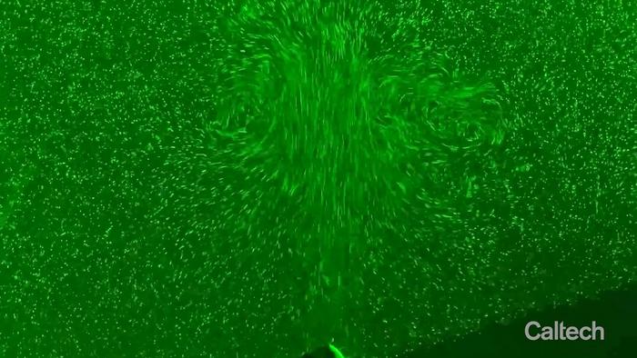 Gunnarson wanted to understand exactly how a current pushes a robot around. He attached a thruster to the wall of a 16-foot-long tank in Dabiri's lab in the Guggenheim Aeronautical Laboratory on Caltech's campus in order to repeatedly generate what are called vortex rings—basically the underwater equivalents of smoke rings. Vortex rings are a good representation of the types of disturbances an underwater explorer would encounter in the chaotic fluid flow of the ocean.