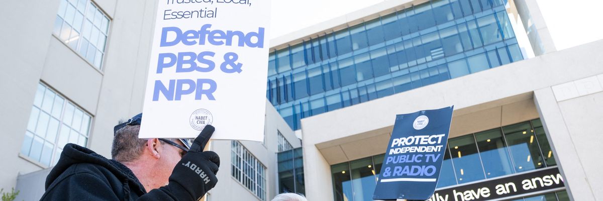 People participate in a rally to call on Congress to protect funding for U.S. public broadcasters, Public Broadcasting Service (PBS) and National Public Radio (NPR), outside the NPR headquarters in Washington, D.C., on March 26, 2025.