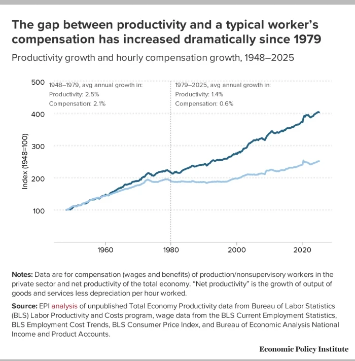 I rarely ask you to look at charts. Today is an exception. This one is from the Economic Policy Institute. It compares the typical American’s pay starting just after World War II (light blue line) with the nation’s increasing productivity since then (dark blue).