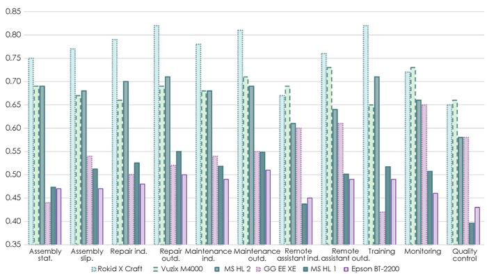 Figure | General performance comparison for the camera-enabled headsets. The diagram presents the proposed general performance indicator for the camera-enabled headsets in relation to application cases: stationary or slipway assembly, indoor and outdoor repair, indoor and outdoor maintenance, indoor and outdoor remote assistance, training, monitoring and quality control. The maximum value of 1 corresponds to the optimal parameters for the headset, considering the specified weighting factors.
