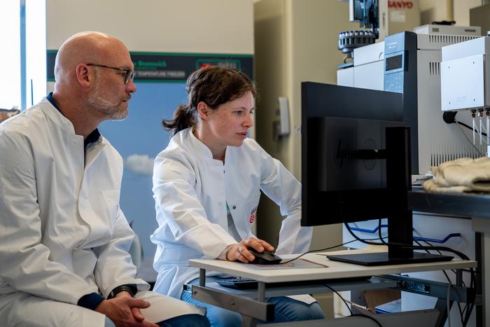 Dr. Vera Meyer and Dr. Enno Schefuß discuss the isolation of organic compounds at the preparative gas chromatograph. Photo: MARUM – Center for Marine Environmental Sciences, University of Bremen; V. Diekamp