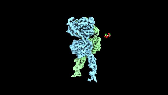Cryo-EM map of the human sweet taste receptor (blue and green) changing shape as it binds a molecule that tastes sweet (red and green).