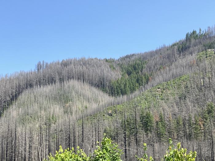 This photo of the aftermath of the 2020 Riverside Fire shows fire refugia — the green islands of live trees that remain after forest fires. The Riverside Fire had nearly even relative proportions of forest loss annually for 3 years post-fire.