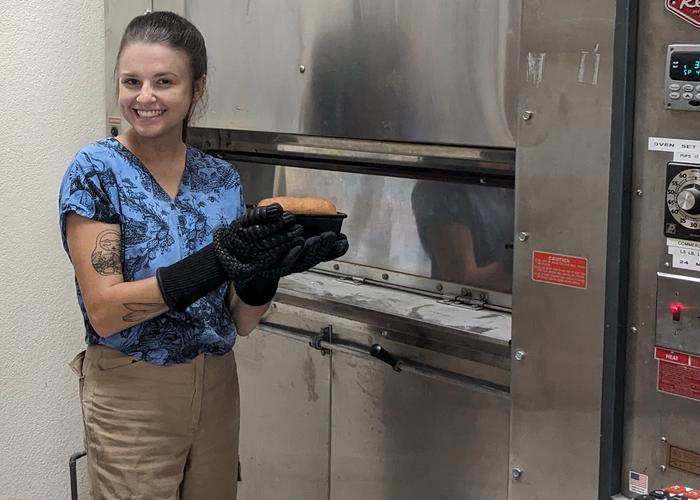 Maria Rottersman of UC Davis holds a loaf of baked bread made using seed varieties developed without alpha-gliadin proteins, a component of gluten.