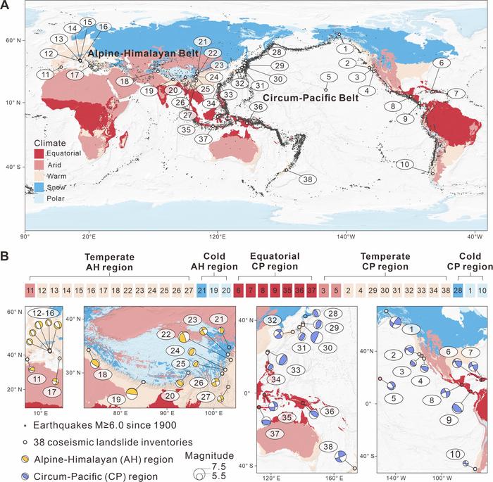 (A) Coseismic landslide inventories within the Alpine-Himalayan and Circum-Pacific belts. (B) The enlarged view of highlighted 38 earthquakes. The five Köppen-Geiger climate zones are here simplified into three for region division: cold (polar plus snow); temperate (warm plus arid); and equatorial. Beachballs signify primary seismic rupture dynamics.