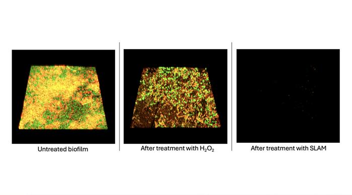“The SLAM particles remove more than 95 % of the matrix and cells. However, the biofilm regrows because 5 % are left, with some remaining matrix. So, the mixture of H2O2 and PAA can be applied as a final step to remove residual cells,” Kong said.