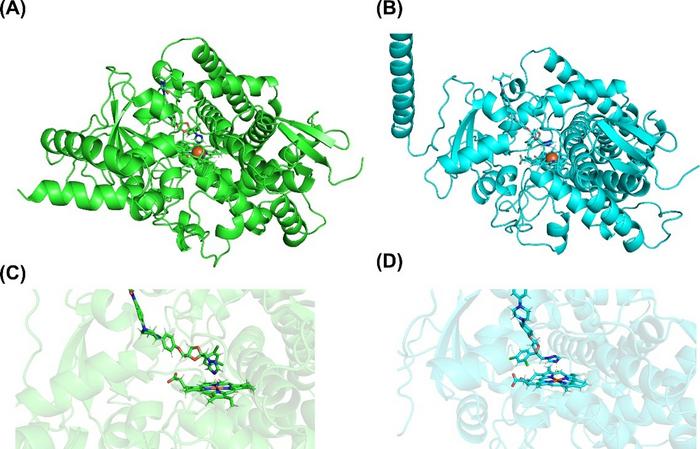 Models of the proteins produced by Madurella fahalii: CYP51A (A and C) and CYP51A2 (B and D). In each panel, itraconazole and heme are illustrated in a stick representation in the upper and lower parts, respectively. (A) and (B) represent the overall structure of CYP51 proteins. In (C) and (D), the active centers of (A) and (B) were enlarged with their protein backbones made translucent, respectively.