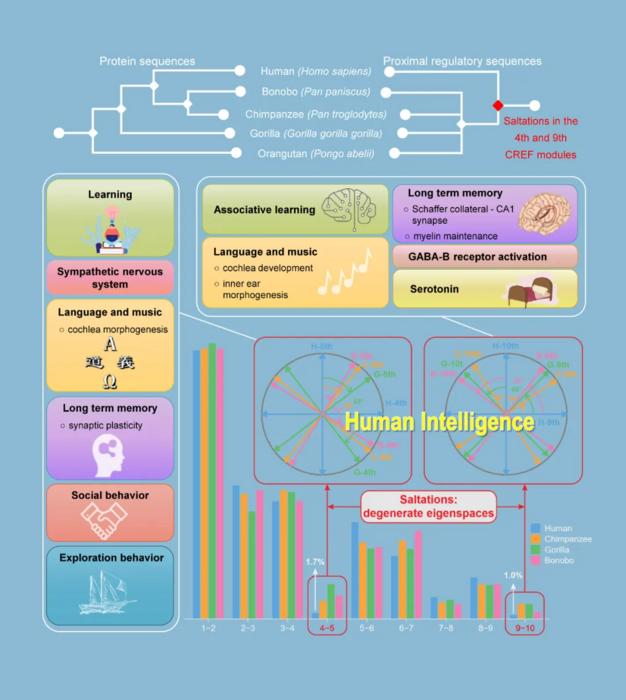 The researchers extracted 10 principal regulatory modules from the whole-genome data and ranked them in descending order of binding energy. By comparing the CREF modules of four hominid species, they discovered that two regulatory modules underwent saltations: one between the 4th and 5th eigen-levels and another between the 9th and 10th. The newly regulated gene targets include those associated with long-term memory, cochlea development, learning, exploration behavior, social behavior, and regulation of sleep and happiness. Without any a priori, the CREF module can largely explain the saltation of human cognition and intelligence, offering a new quantitative paradigm for studying the evolution of gene regulation.