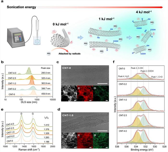 Synthesis and characterization of sonicated CNT catalysts. a) Schematic illustration of the synthesis of sonicated CNT catalysts. b) Size distribution of sonicated CNT catalysts determined by DLS. Morphology and chemical composition of c) CNT-0 and d) CNT-1.0 in TEM images (scale bar = 10 nm) and the corresponding EDX mappings (scale bar = 20 nm). e) Raman and f) O 1s XPS spectra of sonicated CNT catalysts.