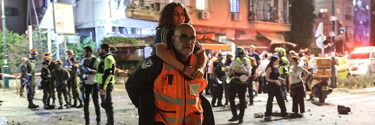 A rescuer carries an injured girl on his back in an area hit by a missile fired from Iran, in Ramat Gan near Tel Aviv on June 13, 2025. Iran fired a barrage of ballistic missiles at Israel in a counter-strike in the evening on June 13, after an unprovoked onslaught hammered nuclear facilities, bases, and residential targets in Iran.