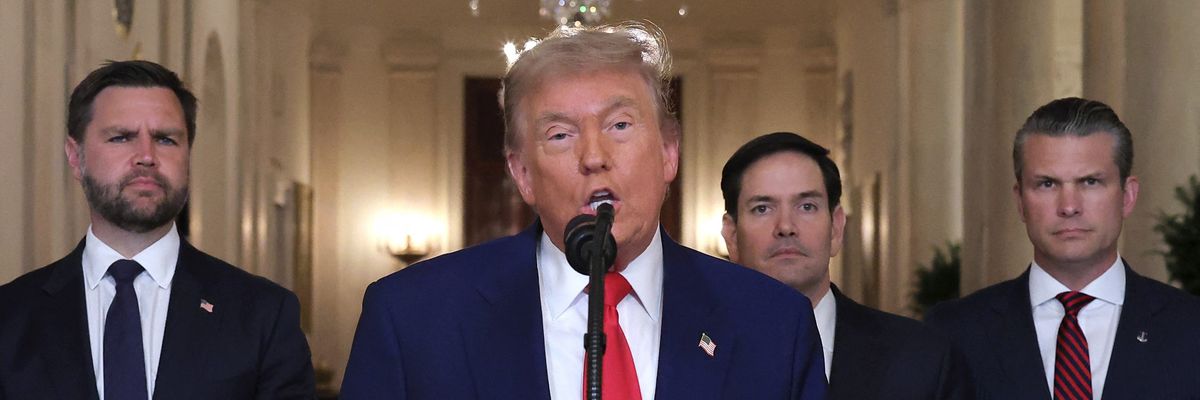 U.S. President Donald Trump addresses the nation, alongside U.S. Vice President JD Vance (L), U.S. Secretary of State Marco Rubio (2nd R), and U.S. Secretary of Defense Pete Hegseth (R), from the White House in Washington, D.C. on June 21, 2025.