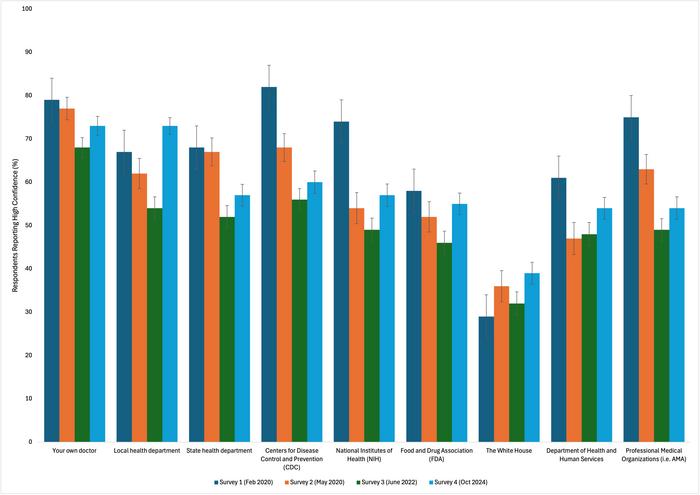 The authors found a significant decline in mean confidence among US adults in health institutions including the Centers for Disease Control and Prevention (CDC), with respondents reporting high confidence in the CDC dropping from 82 percent in February 2020 to a low of 56 percent in June 2022. Reported high confidence in the National Institutes of Health (NIH), Department of Health and Human Services, state health departments, and professional medical organizations followed a similar pattern (dropping by 25 percent, 13 percent, 16 percent, and 26 percent respectively in the same time period). Though confidence in their own doctor and local health departments also decreased in the early years of the pandemic, from February 2020-June 2022, respondents’ confidence in their doctors and local health departments increased by 5 percent and 19 percent respectively from 2022 to 2024. High confidence in the White House increased from 29 percent in February 2020 to 39 percent by October 2024.