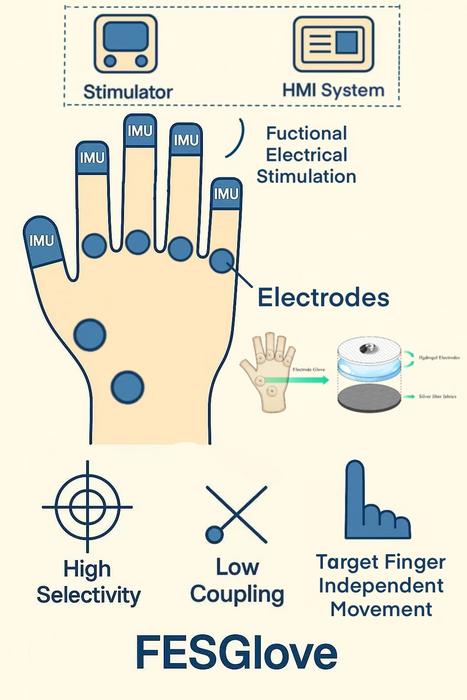The FESGlove system integrates a multi-channel stimulator, a human-machine interface, and a wearable glove with embedded silver fiber and hydrogel electrodes. Functional electrical stimulation is delivered to specific hand muscles and nerves to achieve high selectivity, low finger coupling, and precise independent movement of the target finger.