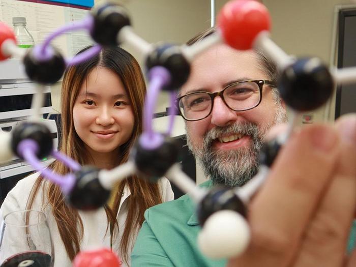 Study first author Yanxin Lin, left, and senior author Misha Kwasniewski examine the structure of the chemical catechin, an important polyphenol and building block of tannins. The new tannin-measurement method breaks large, complex structures into catechin ions and other fragments to characterize the original structure.