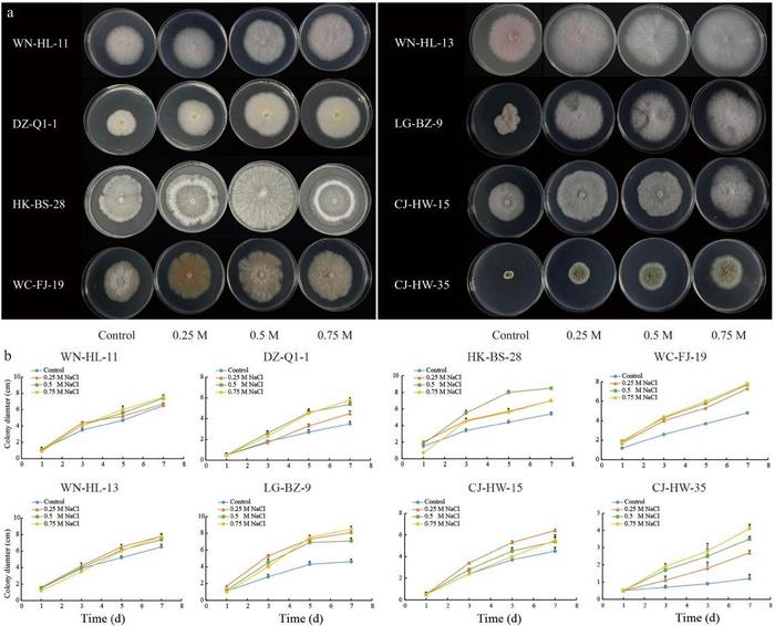 (a) Phenotypes of eight highly salt-tolerant EF on PDA plates with different salt concentrations. (b) Growth diameter of eight EF strains shown in (a) within 7 d.