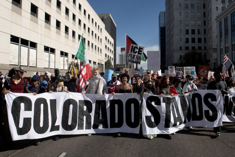 Demonstrators hold a "Colorado Stands" banner as they protest the Trump administration during the "No Kings" national rally in Denver, Colorado on June 14, 2025, on the day of President Trump's military parade in Washington, DC. © Jason Connolly, AFP