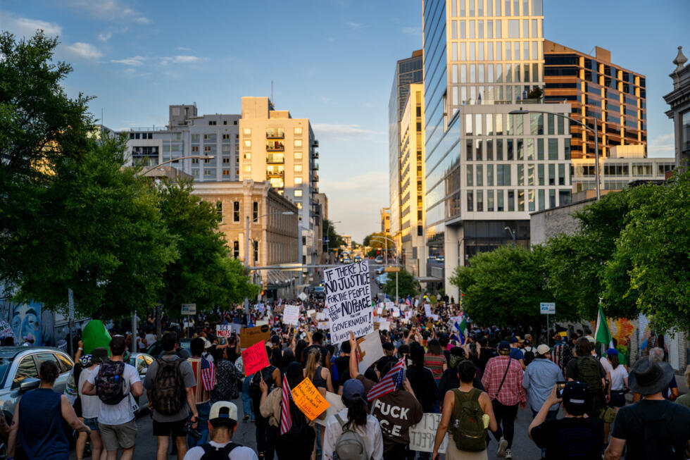 People march through downtown at the conclusion of the "No Kings Day" demonstration on June 14, 2025 in Austin, Texas. © Brandon Bell, AFP