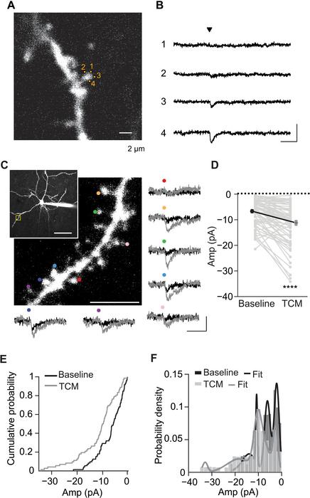 A) Two-photon image of a basal dendrite of L2/3 neuron loaded with Alexa 594. In this example, the spine is ~40 μm below the surface of the slice. Scale bar, 2 μm. (B) Voltage-clamp traces corresponding to single uncaging trials recorded sequentially at the locations indicated by the orange spots in (A). A 0.5-ms uncaging pulse was delivered at the time indicated by the arrowhead. Laser intensity was the same for each trial. Scale bar, 50 pA and 20 ms. (C) Sample image of L2/3 pyramidal neuron (inset) and enlarged dendritic segment (yellow box). Representative sample traces (color coded to match the spine with uEPSC) of some spines are depicted with uEPSC before TCM (black) and after TCM application (gray). Scale bar, 10 pA and 20 ms; 5 and 50 μm (inset). (D) Summary graph, (E) cumulative probability, and (F) probability density plots of uEPSC amplitudes induced by two-photon uncaging of MNI-glutamate onto a single spine head under the baseline condition (black) and after TCM application (gray). (D) Paired t test; 73/4; T72 = 4.98, ****P < 0.0001. Lines in (F) indicate the mixed Gaussian fit of the uEPSC amplitude distribution.