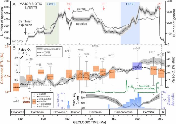 By combining these records with previously published carbonate carbon isotopes, paleo-CO2 data, and records of volcanic activity and plant evolution, the researchers quantitatively explored, through biogeochemical modeling, the global carbon cycle and marine oxygen conditions for this geological period. This work was published in the Proceedings of the National Academy of Sciences of the United States of America (PNAS).