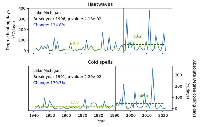 The frequency and intensity of heatwaves and cold spells in the Great Lakes, seen as spikes in these graphs, entered a new regime in the 1990s, according to new research led by the University of Michigan. Using a measurement called degree days that combines the magnitude and duration of a temperature anomaly, the researchers showed the median value more than doubled following a "phase shift" shown as a red line (similar plots are available for all of the Great Lakes).