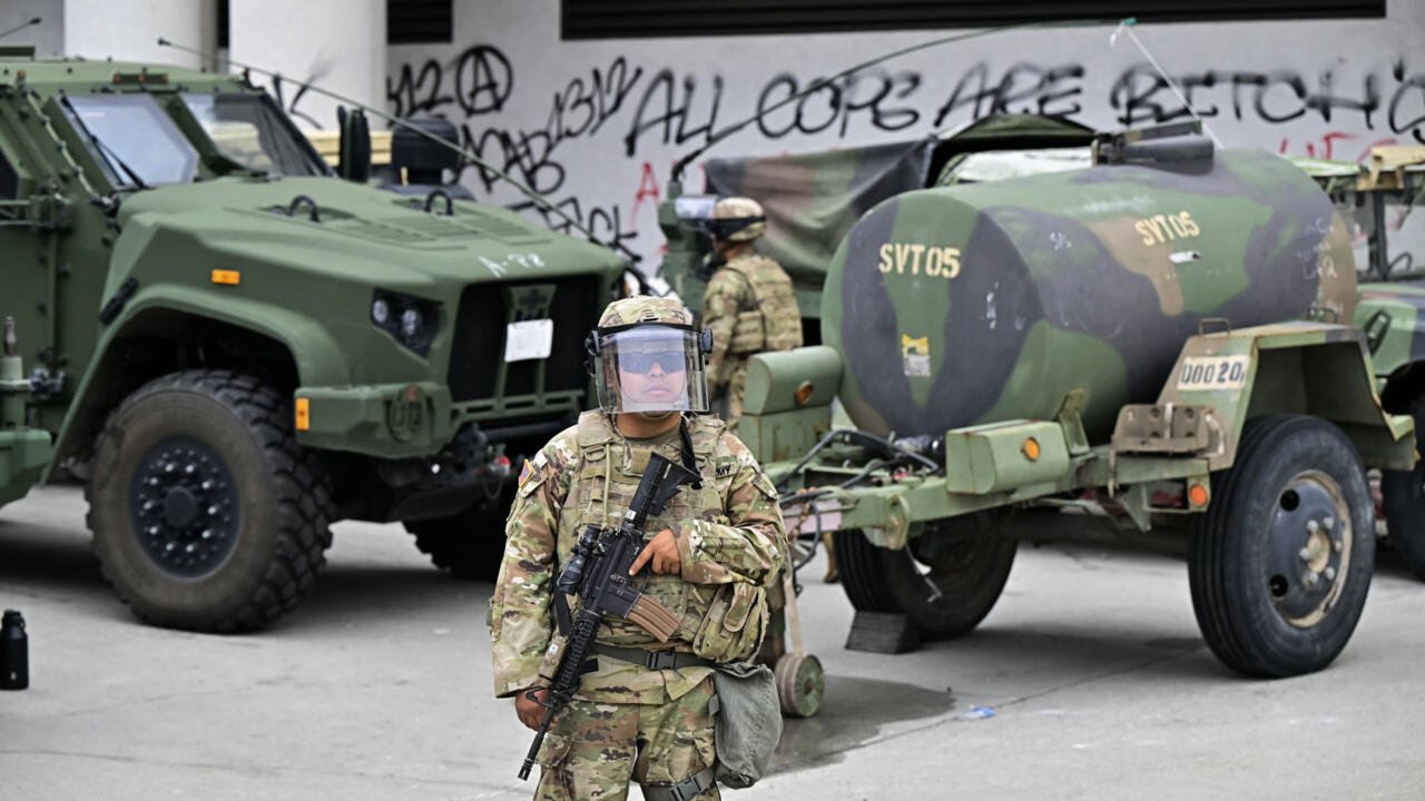 Helmeted troops in camouflage gear and carrying guns were stationed at a federal detention center in downtown Los Angeles, where they joined Department of Homeland Security forces.